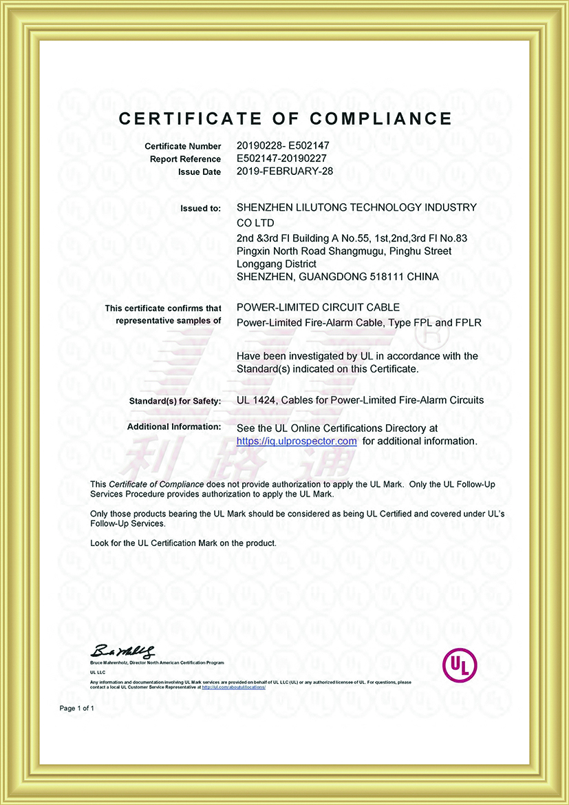 深圳市利路通科技實業有限公司成立于2001年,是一家主要從事防火線纜、硅膠線纜、橡膠線纜、低煙無鹵線纜、通訊線纜、漂浮線纜、耐寒線纜、控制線纜、柔性線纜、電梯線纜、機器人線纜、新能源專用線纜、光纖綜合線等全系列電線電纜的產品設計、研發、生產、銷售、工程方案銷售服務的綜合性企業,產品廣泛應用于消防與安防,通訊,新能源,太陽能,高層樓宇,軌道交通,橋梁,工業4.0設備,船舶,航空,軍工等領域并榮獲深圳高新技術企業、全國守合同重信用企業、深圳市愛心企業、深圳市消防安防百強企業、電線電纜協會理事會單位、國家一級計量體系合格企業、中國優秀民營科技企業。